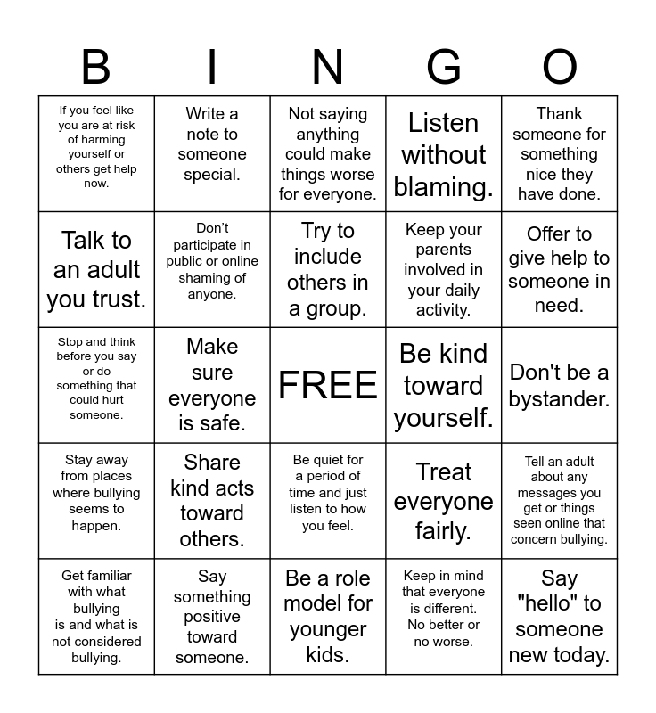 This bingo card has a free space and 26 words: Be quiet for a period of time and just listen to how you feel., Keep in mind that everyone is different. No better or no worse., Try to include others in a group., Say something positive toward someone., Thank someone for something nice they have done., If you feel like you are at risk of harming yourself or others get help now., Talk to an adult you trust., Write a note to someone special., Don't be a bystander., Treat everyone fairly., Keep your parents involved in your daily activity., Stop and think before you say or do something that could hurt someone., Tell an adult about any messages you get or things seen online that concern bullying., Get familiar with what bullying is and what is not considered bullying., Make sure everyone is safe., Always think about what you post. You never know what someone will forward., Listen without blaming., Stay away from places where bullying seems to happen., Not saying anything could make things worse for everyone., Say "hello" to someone new today., Offer to give help to someone in need., Be a role model for younger kids., Be kind toward yourself., Share kind acts toward others., Don’t participate in public or online shaming of anyone. and Write a note to someone special..
