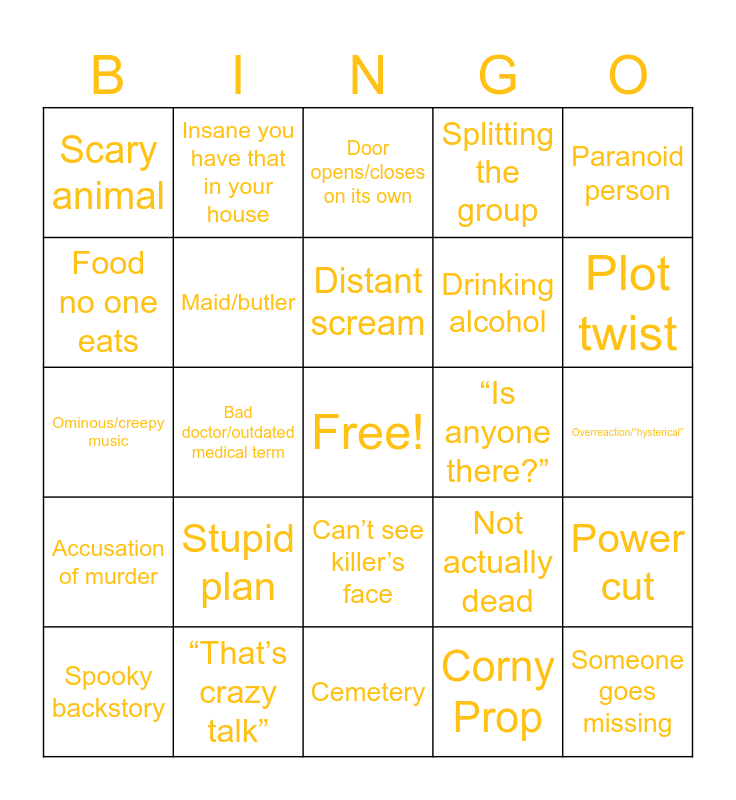 This bingo card has a free space and 32 words: Corny Prop, Chandelier Falls, Bad doctor/outdated medical term, Generic creepy character, Accusation of murder, Maid/butler, Paranoid person, Power cut, Insane you have that in your house, Object moves by itself, Distant scream, Door opens/closes on its own, Someone faints, I’m trapped!, “Is anyone there?”, Rich people amiright, Spooky backstory, Ominous/creepy music, Can’t see killer’s face, Stupid plan, Not actually dead, Forbidden place, Overreaction/“hysterical”, “That’s crazy talk”, Someone goes missing, Splitting the group, Drinking alcohol, Food no one eats, Scary animal, Cemetery, Skeleton and Plot twist.