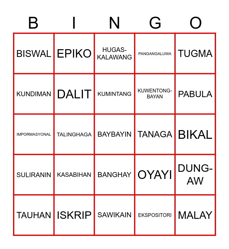 This bingo card has 46 words: NEGRITO, BAYBAYIN, SALAWIKAIN, SAWIKAIN, KASABIHAN, BUGTONG, EPIKO, AWITING-BAYAN, KUNDIMAN, BALITAW, DALIT, PANGANGALUWA, DUNG-AW, OYAYI, DIONA, TALINDAW, KUMINTANG, TANAGA, SUKAT, TUGMA, TALINGHAGA, EKSPOSITORI, BISWAL, KUWENTONG-BAYAN, ALAMAT, PABULA, TAUHAN, TAGPUAN, BANGHAY, SULIRANIN, TUNGGALIAN, PANITIKAN, DULA, KATUTUBO, TANGHALAN, ISKRIP, BIKAL, BALAK, DALLING-DALLING, DALLOT, MALAY, HUGAS-KALAWANG, IMPORMASYONAL, INDONES, IGOROT and IFUGAO.