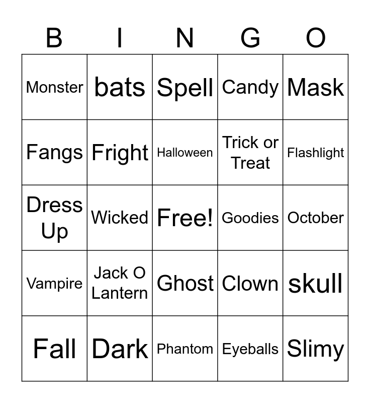 This bingo card has a free space and 65 words: Pumpkin, candle, black cat, skull, zombie, broomstick, bats, graveyard, Halloween, Costumes, Ghost, Haunted House, October, Mask, Spooky, Fangs, Wicked, Monster, Witch, Trick or Treat, Jack O Lantern, Vampire, Candy, Creepy, Blood, Scary, Spider Web, Goblin, Slimy, Scream, Fall, Boo, Bogeyman, Coffin, Clown, Dark, Party, Dress Up, Eyeballs, Eerie, Fright, Face Paint, Goodies, Hocus Pocus, Hayride, Lantern, Flashlight, Moonlight, Mysterious, Nightmare, Owl, Orange, Black, Phantom, Prank, Shadow, Sweets, Spell, Skeleton, Spider, Trick, Treat, Werewolf, Wand and wig.