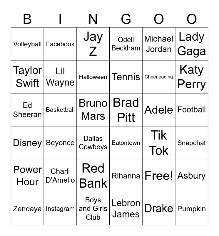 This bingo card has 37 words: Free!, Rihanna, Drake, Taylor Swift, Beyonce, Adele, Lil Wayne, Lebron James, Michael Jordan, Zendaya, Katy Perry, Odell Beckham, Ed Sheeran, Bruno Mars, Lady Gaga, Brad Pitt, Charli D'Amelio, Jay Z, Football, Basketball, Volleyball, Tennis, Dallas Cowboys, Tik Tok, Instagram, Snapchat, Facebook, Boys and Girls Club, Asbury, Red Bank, Tinton Falls, Eatontown, Cheerleading, Power Hour, Disney, Halloween and Pumpkin.