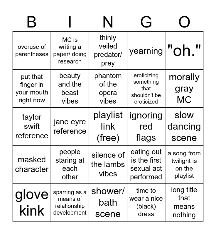 This bingo card has a free space and 24 words: people staring at each other, sparring as a means of relationship development, phantom of the opera vibes, glove kink, "oh.", overuse of parentheses, put that finger in your mouth right now, MC is writing a paper/ doing research, ignoring red flags, silence of the lambs vibes, eroticizing something that shouldn't be eroticized, taylor swift reference, eating out is the first sexual act performed, a song from twilight is on the playlist, beauty and the beast vibes, time to wear a nice (black) dress, slow dancing scene, thinly veiled predator/ prey, morally gray MC, jane eyre reference, long title that means nothing, masked character, yearning and shower/ bath scene.