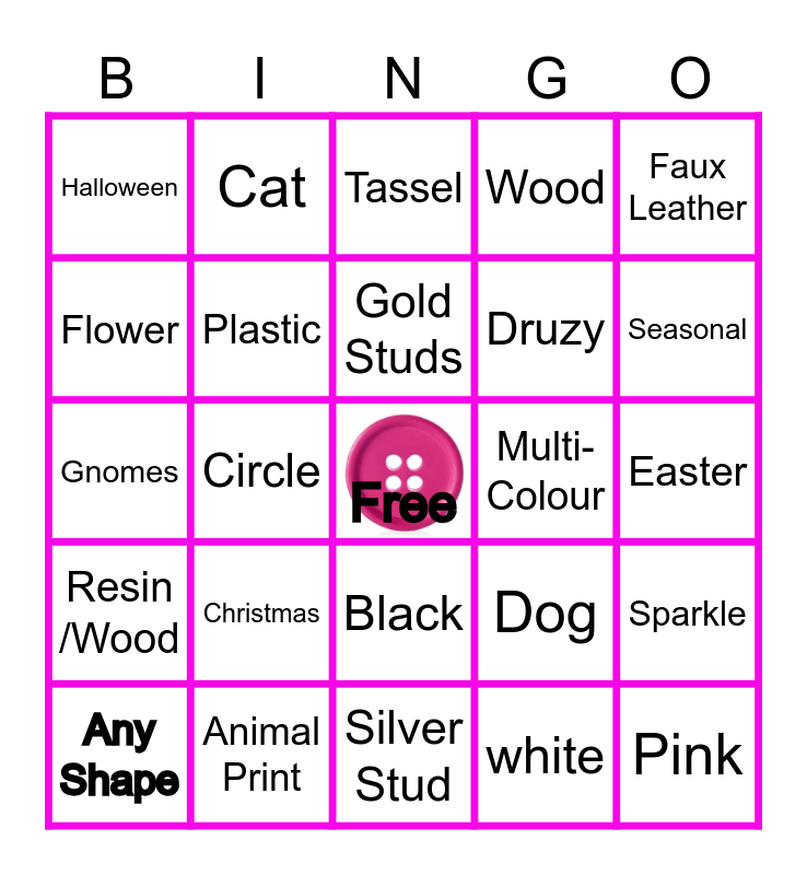 This bingo card has a free space and 24 words: Any Shape, Christmas, Gold Studs, white, Faux Leather, Halloween, Cat, Tassel, Multi- Colour, Easter, Gnomes, Plastic, Dog, Sparkle, Flower, Animal Print, Silver Stud, Wood, Seasonal, Resin /Wood, Circle, Black, Druzy and Pink.