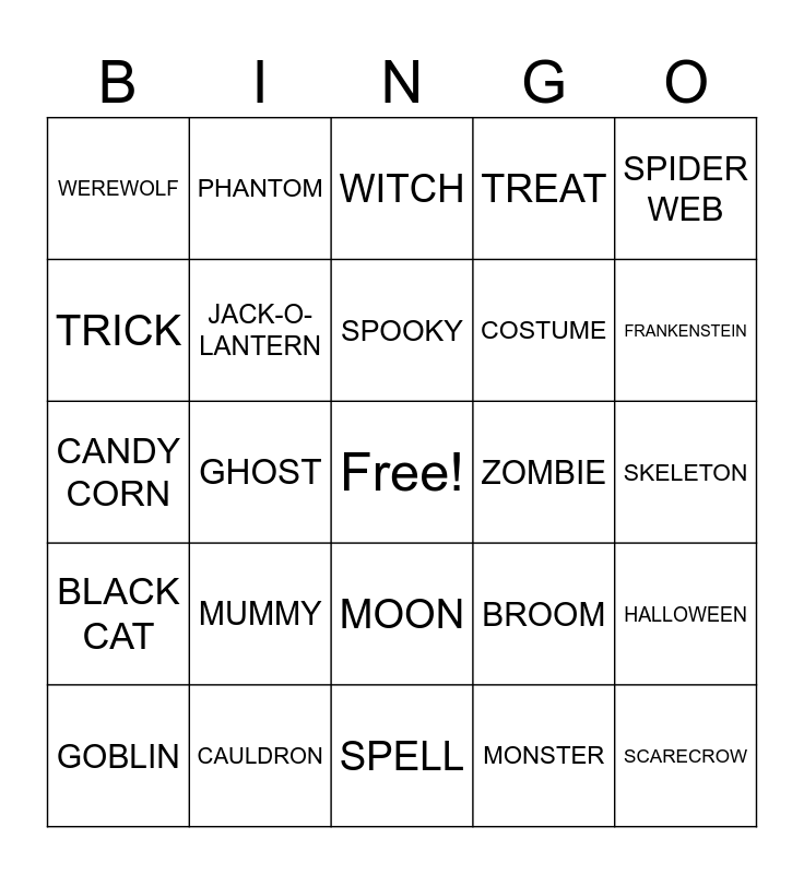 This bingo card has a free space and 29 words: GOBLIN, GHOUL, GHOST, VAMPIRE, WEREWOLF, WITCH, JACK-O-LANTERN, MUMMY, ZOMBIE, CAULDRON, SKELETON, SCARECROW, SPELL, MONSTER, FRANKENSTEIN, BAT, MOON, BLACK CAT, SPIDER WEB, CANDY CORN, BROOM, POTION, COSTUME, TRICK, TREAT, PHANTOM, HALLOWEEN, SPOOKY and PUMPKIN.