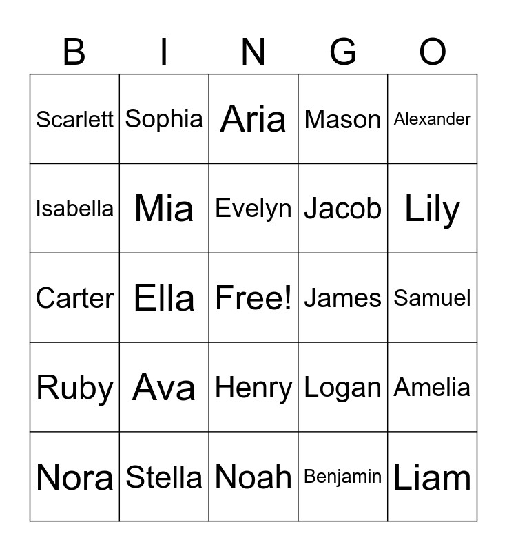 This bingo card has a free space and 50 words: Emma, Liam, Olivia, Noah, Ava, Oliver, Sophia, Elijah, Isabella, Lucas, Mia, Mason, Amelia, Logan, Harper, Ethan, Evelyn, James, Abigail, Alexander, Ella, Benjamin, Scarlett, Jacob, Grace, Michael, Lily, Daniel, Aria, Henry, Chloe, Jackson, Zoe, Sebastian, Stella, Aiden, Natalie, Matthew, Leah, Samuel, Hazel, David, Ellie, Joseph, Nora, Carter, Lucy, Owen, Ruby and Wyatt.
