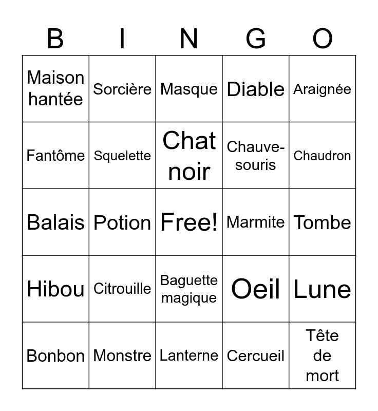 This bingo card has a free space and 24 words: Citrouille, Monstre, Chat noir, Bonbon, Araignée, Maison hantée, Fantôme, Sorcière, Marmite, Baguette magique, Chauve-souris, Balais, Oeil, Lune, Squelette, Cercueil, Tombe, Masque, Chaudron, Potion, Tête de mort, Hibou, Diable and Lanterne.
