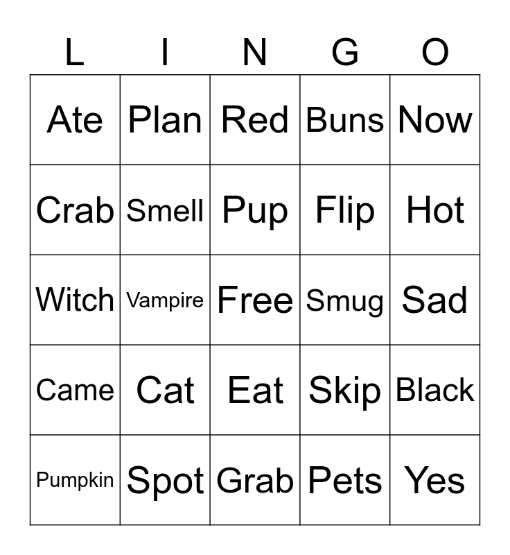 This bingo card has a free space and 24 words: Cat, Spot, Pup, Pumpkin, Now, Ate, Crab, Plan, Smug, Eat, Flip, Witch, Skip, Black, Smell, Pets, Sad, Red, Hot, Vampire, Yes, Came, Buns and Grab.
