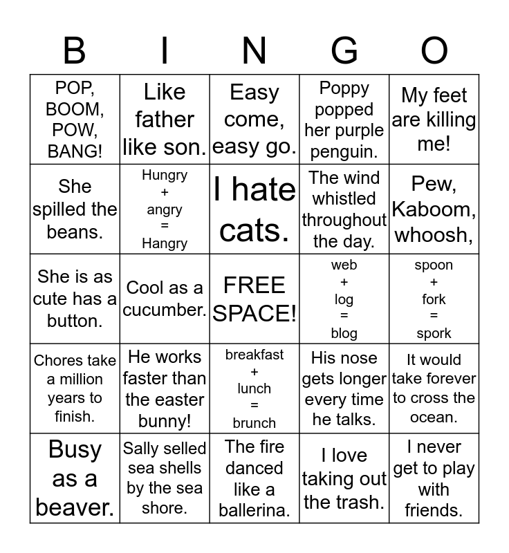 This bingo card has a free space and 24 words: He works faster than the easter bunny!, Sally selled sea shells by the sea shore., I hate cats., Busy as a beaver., My feet are killing me!, POP, BOOM, POW, BANG!, She spilled the beans., Like father like son., web + log = blog, breakfast + lunch = brunch, The wind whistled throughout the day., She is as cute has a button., His nose gets longer every time he talks., It would take forever to cross the ocean., Hungry + angry = Hangry, I love taking out the trash., spoon + fork = spork, Easy come, easy go., Pew, Kaboom, whoosh,, Cool as a cucumber., I never get to play with friends., Chores take a million years to finish., Poppy popped her purple penguin. and The fire danced like a ballerina..