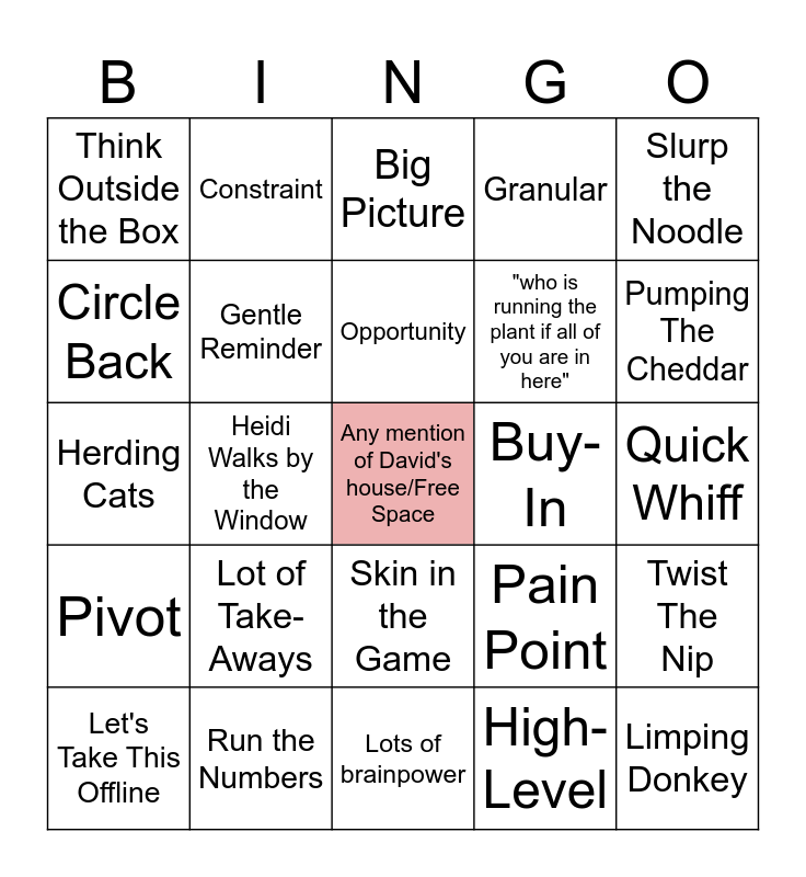 This bingo card has a free space and 24 words: Let's Take This Offline, Lot of Take-Aways, Opportunity, High-Level, Slurp the Noodle, Think Outside the Box, Constraint, Big Picture, Buy-In, Quick Whiff, Herding Cats, Gentle Reminder, Pain Point, Twist The Nip, Circle Back, Run the Numbers, Lots of brainpower, Granular, Pumping The Cheddar, Pivot, Heidi Walks by the Window, Skin in the Game, "who is running the plant if all of you are in here" and Limping Donkey.