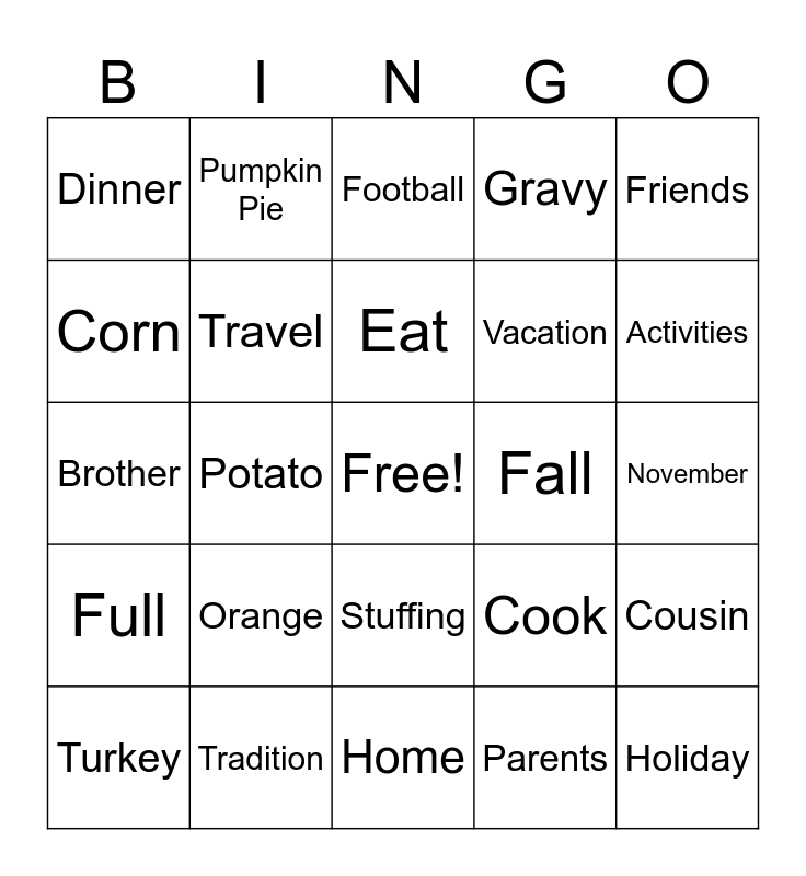 This bingo card has a free space and 39 words: Thank You, Family, Community, Travel, Turkey, Stuffing, Eat, Green Brean, Friends, Full, Potato, Gravy, Holiday, November, Fall, Orange, Red, Dinner, Bake, Cook, Corn, Home, Vacation, Activities, Butter, America, Table, Please, Apple Pie, Pumpkin Pie, Bread, Enjoy, Football, Tradition, Parents, Grandparents, Cousin, Brother and Sister.
