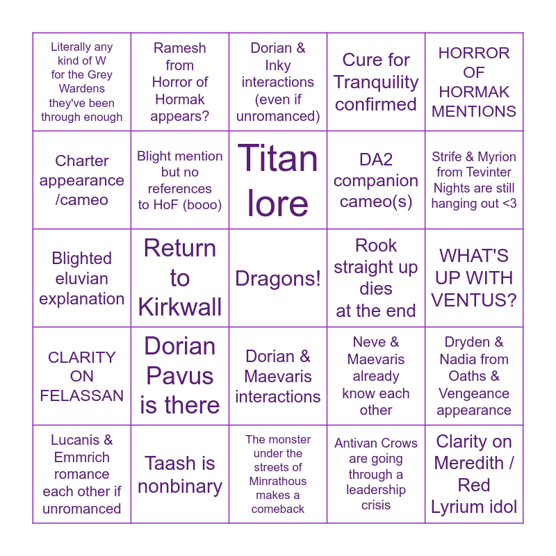 This bingo card has a free space and 24 words: Dorian Pavus is there, Taash is nonbinary, Titan lore, Lucanis & Emmrich romance each other if unromanced, HORROR OF HORMAK MENTIONS, Literally any kind of W for the Grey Wardens they've been through enough, Charter appearance /cameo, Ramesh from Horror of Hormak appears?, Rook straight up dies at the end, Dorian & Maevaris interactions, DA2 companion cameo(s), Blighted eluvian explanation, Neve & Maevaris already know each other, Dryden & Nadia from Oaths & Vengeance appearance, Blight mention but no references to HoF (booo), Antivan Crows are going through a leadership crisis, WHAT'S UP WITH VENTUS?, Dorian & Inky interactions (even if unromanced), Strife & Myrion from Tevinter Nights are still hanging out <3, Return to Kirkwall, Clarity on Meredith / Red Lyrium idol, CLARITY ON FELASSAN, Cure for Tranquility confirmed and The monster under the streets of Minrathous makes a comeback.