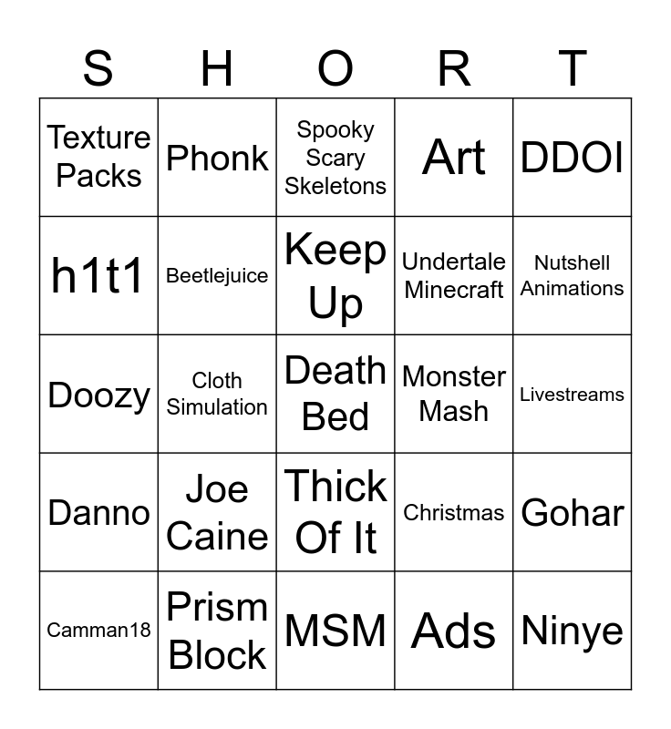 This bingo card has a free space and 24 words: Joe Caine, Prism Block, Keep Up, Camman18, DDOI, Texture Packs, h1t1, Phonk, Monster Mash, Thick Of It, Undertale Minecraft, Doozy, Christmas, Gohar, Beetlejuice, Ads, Livestreams, Spooky Scary Skeletons, Nutshell Animations, Cloth Simulation, Ninye, Danno, Art and MSM.