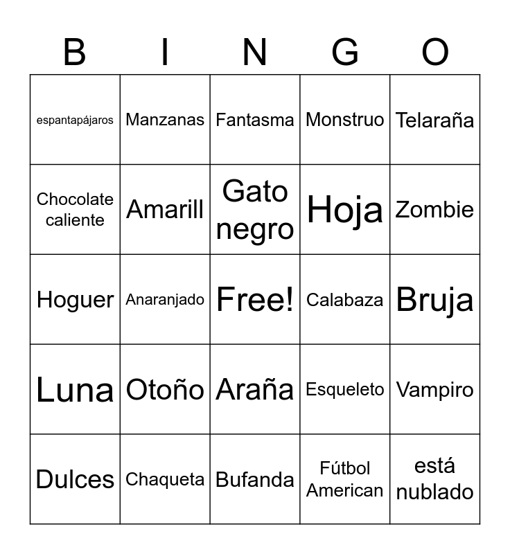 This bingo card has a free space and 24 words: Otoño, Chaqueta, Gato negro, Dulces, Telaraña, espantapájaros, Chocolate caliente, Manzanas, Calabaza, Araña, Hoja, Hoguer, Esqueleto, Vampiro, Amarill, Fútbol American, Bruja, Fantasma, Zombie, Anaranjado, está nublado, Luna, Monstruo and Bufanda.
