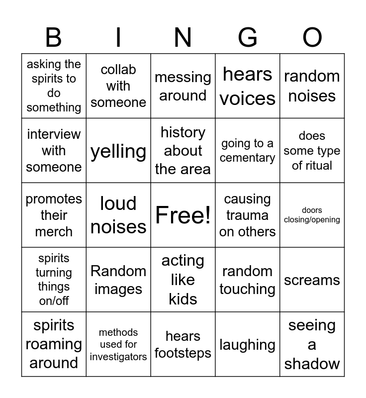 This bingo card has a free space and 24 words: Random images, methods used for investigators, history about the area, spirits roaming around, random noises, asking the spirits to do something, interview with someone, collab with someone, causing trauma on others, acting like kids, going to a cementary, promotes their merch, random touching, screams, yelling, laughing, doors closing/opening, messing around, does some type of ritual, loud noises, seeing a shadow, spirits turning things on/off, hears voices and hears footsteps.