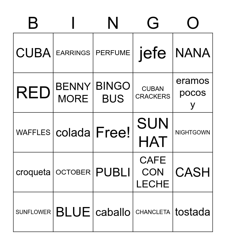 This bingo card has a free space and 24 words: OCTOBER, BLUE, BINGO BUS, SUNFLOWER, NANA, CUBA, RED, EARRINGS, SUN HAT, PUBLI, CUBAN CRACKERS, WAFFLES, CAFE CON LECHE, CASH, BENNY MORE, CHANCLETA, NIGHTGOWN, PERFUME, eramos pocos y, colada, tostada, croqueta, jefe and caballo.