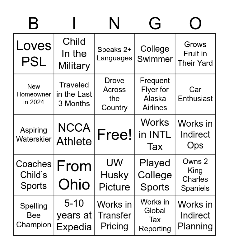 This bingo card has a free space and 30 words: 5-10 years at Expedia, Washington Native, NCCA Athlete, Pet Owner, Loves PSL, Speaks 2+ Languages, Traveled in the Last 3 Months, UW Husky Picture, Works in INTL Tax, Works in Transfer Pricing, Works in Indirect Ops, Works in Indirect Planning, Works in Global Tax Reporting, Halloween Fan, Car Enthusiast, In College Marching Band, Played College Sports, Coaches Child’s Sports, From Ohio, Grows Fruit in Their Yard, Aspiring Waterskier, Band Member, Child In the Military, Frequent Flyer for Alaska Airlines, New Homeowner in 2024, College Swimmer, Owns 2 King Charles Spaniels, Spelling Bee Champion, Drove Across the Country and Wine Enthusiast.