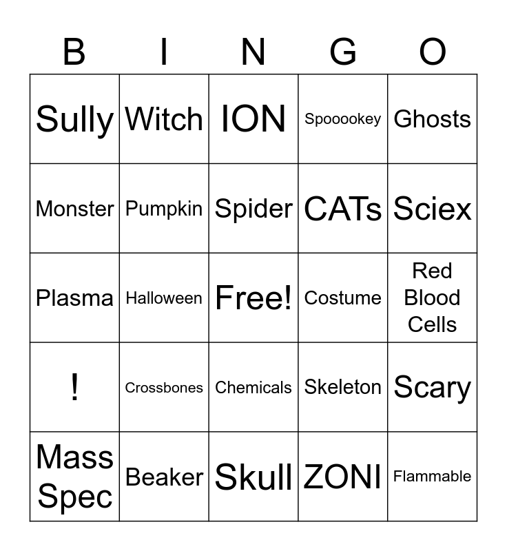 This bingo card has a free space and 51 words: Hazardous, Flammable, Toxic, Skull, Crossbones, Zombie, Witch, CMSL, Monster, October, Pumpkin, Spooookey, Scary, Skeleton, Vampire, Mummy, Spider, Costume, BATS, Ghosts, Halloween, ZONI, Sully, CATs, ECU-plasm, Geralt, Sciex, Mass Hunter, Mass Spec, ION, Contamination, Dissolve, Voltage, Vapor, Safety Glasses, Beaker, Potion, Gloves, Poison, Whole Blood, Red Blood Cells, !, Adrenaline, Corrosion, Acid, Cortisol, Plasma, Specimen, Test Tube, Chemicals and Lazarus.