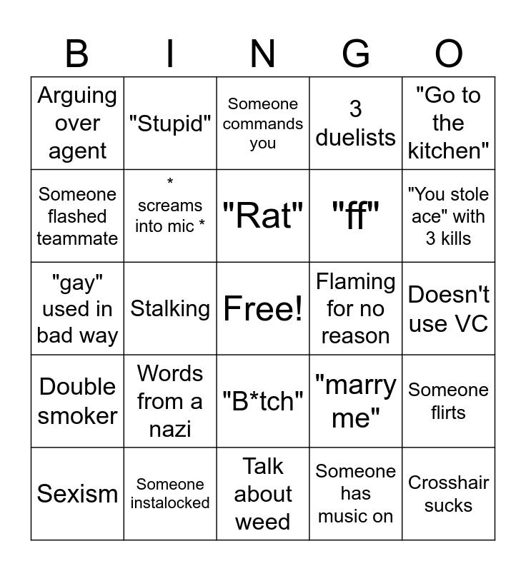 This bingo card has a free space and 24 words: Words from a nazi, Someone instalocked, "Rat", Sexism, "Go to the kitchen", Arguing over agent, Someone flashed teammate, "Stupid", Flaming for no reason, "B*tch", "ff", "gay" used in bad way, "marry me", Someone flirts, * screams into mic *, Someone has music on, Doesn't use VC, Someone commands you, "You stole ace" with 3 kills, Stalking, Crosshair sucks, Double smoker, 3 duelists and Talk about weed.