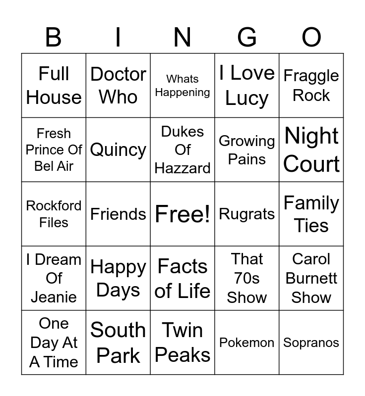 This bingo card has a free space and 64 words: A Team, Beverly Hills 90210, Breaking Bad, Carol Burnett Show, Charlies Angels, Cheers, Doctor Who, Duck Tales, Dukes Of Hazzard, Dynasty, Facts of Life, Family Guy, Family Ties, Fraggle Rock, Frasier, Fresh Prince Of Bel Air, Friends, Full House, Good Times, Growing Pains, Happy Days, I Dream Of Jeanie, I Love Lucy, Jeffersons, Knight Rider, Laverne & Shirley, Law & Order, Love Boat, Magilla Gorilla, Mary Tyler Moore Show, Melrose Place, Mission Impossible, Moonlighting, Mork & Mindy, Night Court, One Day At A Time, Partridge Family, Pokemon, Popeye, Quincy, Rockford Files, Rugrats, Saved By The Bell, Scooby Doo, Shameless, Sopranos, South Park, Survivor, That 70s Show, The Twilight Zone, Three's Company, Tiny Toons Adventures, Twin Peaks, V (The Series), Walking Dead, Welcome Back Kotter, Whats Happening, Whos The Boss, WKRP In Cincinnati, Wonder Woman, Wonder Years, Woody Woodpecker Show, X-Files and Yogi Bear.
