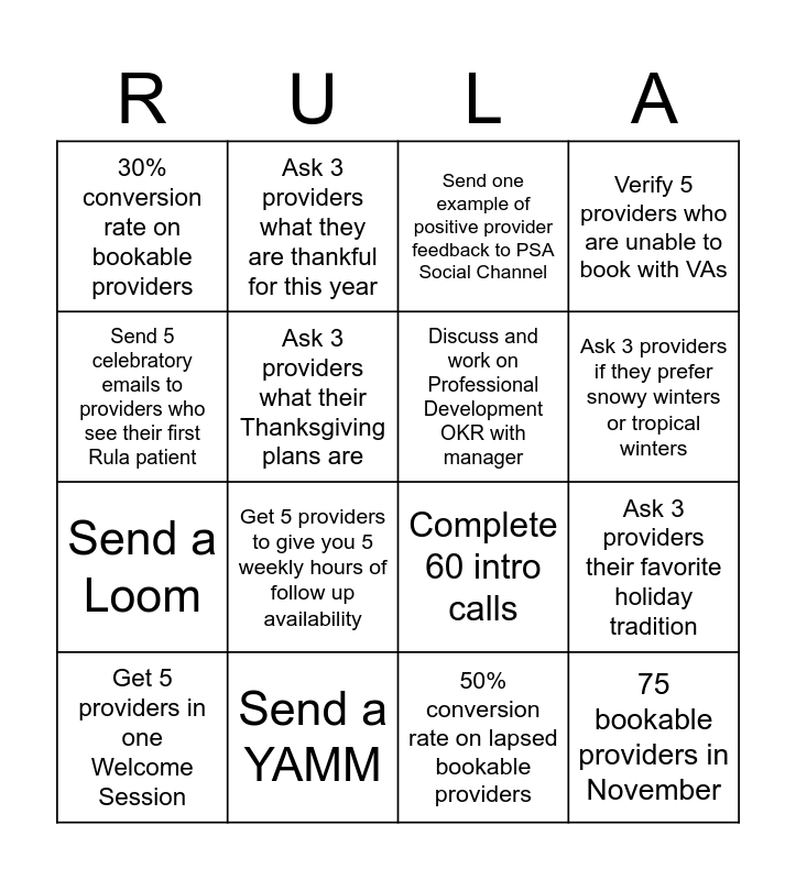 This bingo card has 16 words: Send a YAMM, Ask 3 providers their favorite holiday tradition, Send one example of positive provider feedback to PSA Social Channel, 30% conversion rate on bookable providers, Send a Loom, Ask 3 providers what they are thankful for this year, Complete 60 intro calls, 50% conversion rate on lapsed bookable providers, Send 5 celebratory emails to providers who see their first Rula patient, Ask 3 providers what their Thanksgiving plans are, Get 5 providers in one Welcome Session, Verify 5 providers who are unable to book with VAs, Get 5 providers to give you 5 weekly hours of follow up availability, Ask 3 providers if they prefer snowy winters or tropical winters, Discuss and work on Professional Development OKR with manager and 75 bookable providers in November.