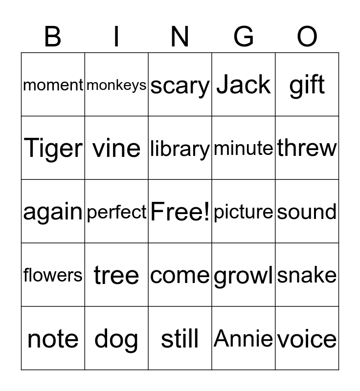 This bingo card has a free space and 24 words: tree, dog, library, note, gift, moment, Tiger, monkeys, picture, come, minute, again, growl, snake, vine, Annie, sound, scary, threw, perfect, voice, flowers, Jack and still.