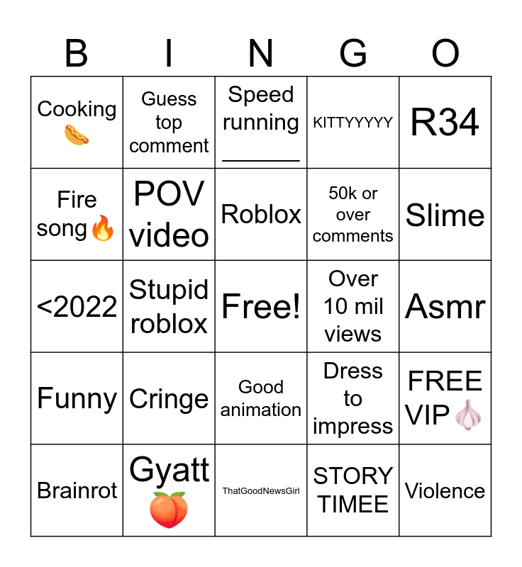 This bingo card has a free space and 24 words: Cringe, Gyatt🍑, Roblox, Brainrot, R34, Cooking🌭, Fire song🔥, Guess top comment, Over 10 mil views, Good animation, 50k or over comments, <2022, Dress to impress, FREE VIP🧄, POV video, STORY TIMEE, Asmr, Speed running ______, Slime, Stupid roblox, Violence, Funny, KITTYYYYY and ThatGoodNewsGirl.