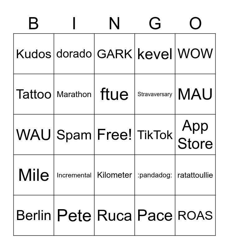 This bingo card has a free space and 29 words: Berlin, Promos, Spam, Run Club, Kudos, GARK, Marathon, Incremental, TikTok, Pete, App Store, ROAS, Ruca, Pace, MAU, Martini, Kilometer, Mile, WOW, WAU, :pandadog:, Subs, Stravaversary, Tattoo, kevel, dorado, ratattoullie, ftue and iterable.