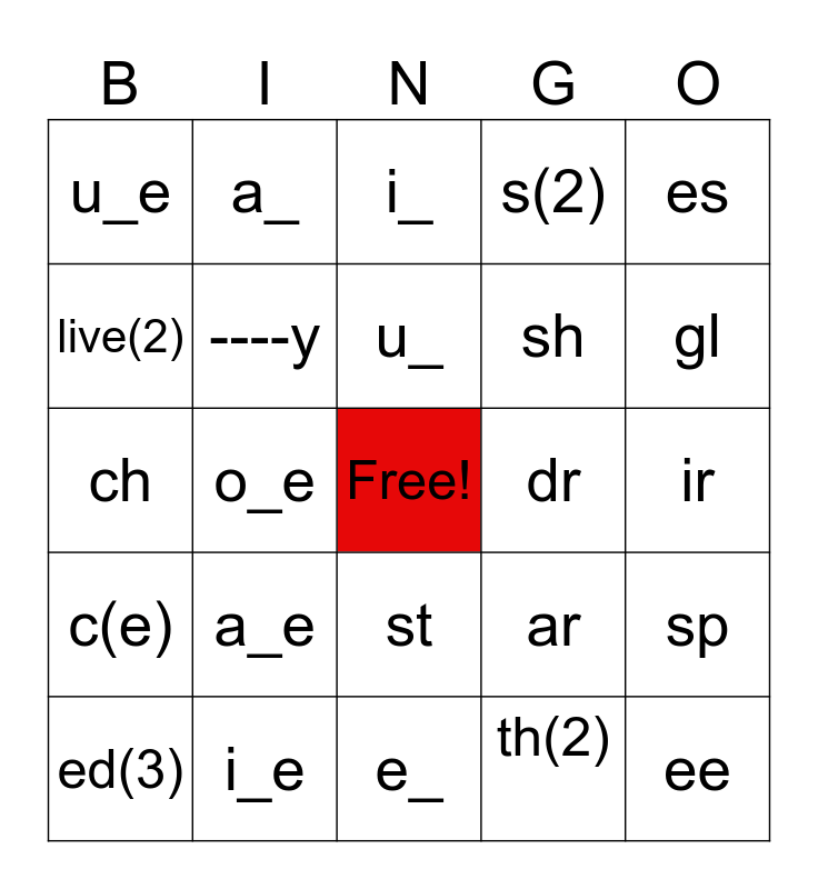 This bingo card has a free space and 24 words: a_e, i_e, u_, ed(3), es, u_e, live(2), a_, dr, st, sh, ch, ar, sp, ----y, th(2), ir, i_, gl, o_e, ee, c(e), s(2) and e_.