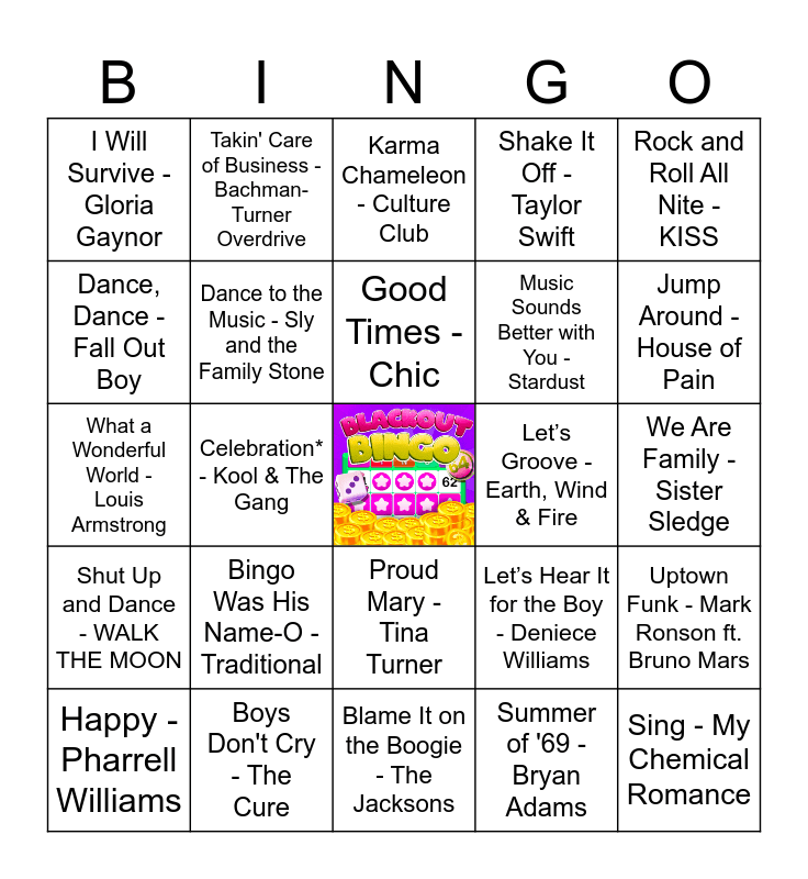 This bingo card has a free space and 38 words: Music - Madonna, I Love Music - The O'Jays, Let’s Get It On - Marvin Gaye, Dance to the Music - Sly and the Family Stone, Uptown Funk - Mark Ronson ft. Bruno Mars, Bingo Was His Name-O - Traditional, Good Times - Chic, I Gotta Feeling - The Black Eyed Peas, Rock and Roll All Nite - KISS, Music Sounds Better with You - Stardust, Celebration* - Kool & The Gang, Shake It Off - Taylor Swift, Sing - My Chemical Romance, We Are Family - Sister Sledge, Dance, Dance - Fall Out Boy, Shut Up and Dance - WALK THE MOON, Play That Funky Music - Wild Cherry, Karma Chameleon - Culture Club, I Want to Dance with Somebody - Whitney Houston, Let’s Groove - Earth, Wind & Fire, I Will Survive - Gloria Gaynor, Boys Don't Cry - The Cure, Jump Around - House of Pain, Happy - Pharrell Williams, Dance Monkey - Tones and I, Blame It on the Boogie - The Jacksons, Get Lucky - Daft Punk ft. Pharrell Williams, Party in the USA - Miley Cyrus, Ain't Nobody- Chaka Khan, You Make My Dreams - Hall & Oates, Dancing Queen - ABBA, Proud Mary - Tina Turner, Summer of '69 - Bryan Adams, Takin' Care of Business - Bachman-Turner Overdrive, The Music Never Stopped - Grateful Dead, Let’s Hear It for the Boy - Deniece Williams, What a Wonderful World - Louis Armstrong and Born to Run - Bruce Springsteen.