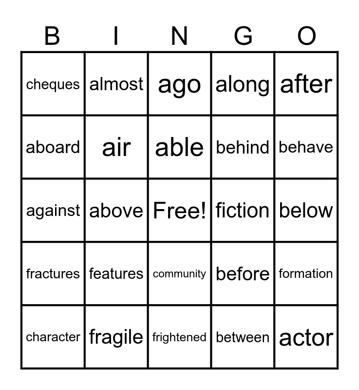 This bingo card has a free space and 75 words: a, add, ago, all, am, an, and, are, as, at, ate, away, able, aboard, about, above, actions, actor, adventure, after, again, against, air, almost, along, also, although, baby, backyard, bare, beach, beaks, because, before, behave, behind, being, belly, below, between, bigger, calm, carriage, category, celebration, certain, character, cheques, chocolate, circuit, college, community, competition, complaining, complete, concerned, confidence, consider, famous, favourite, features, February, fellowship, fete, fibre, fiction, field, fierce, formal, formation, fractures, fragile, frenzied, frightened and furniture.