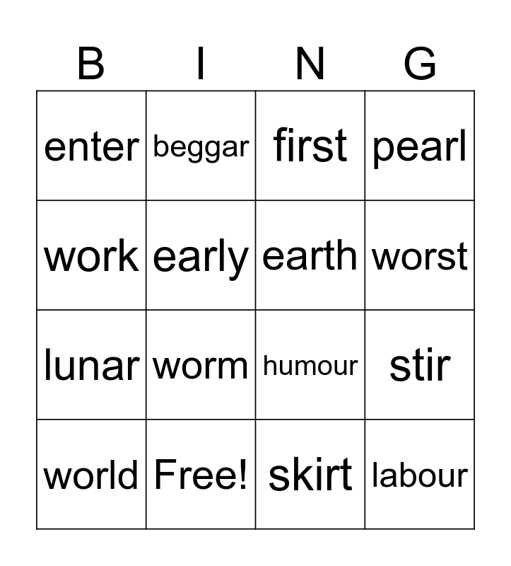 This bingo card has 22 words: Free!, actor, beggar, burn, early, earth, enter, first, humour, labour, lunar, pearl, pillar, rumour, skirt, solar, stir, world, worm, work, worst and learn.