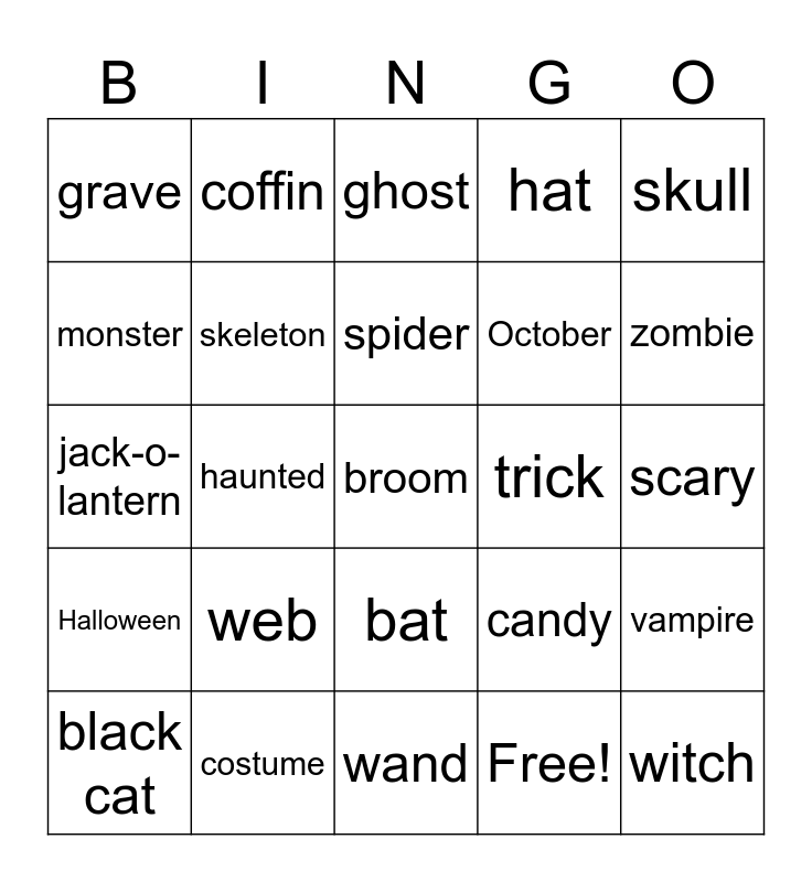 This bingo card has 32 words: Free!, cauldron, haunted, spooky, Halloween, skeleton, skull, vampire, coffin, witch, spider, ghost, mummy, werewolf, trick, treat, black cat, jack-o-lantern, bat, web, candy, boo, scary, costume, broom, hat, October, monster, grave, wand, Frankenstein and zombie.