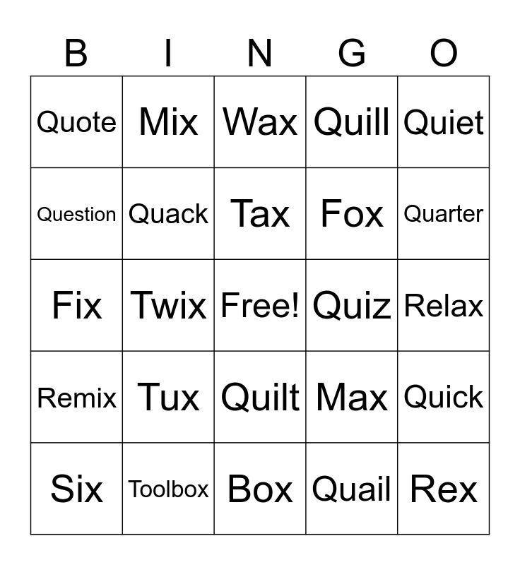 This bingo card has a free space and 25 words: Tux, Box, Tax, Six, Quiet, Quote, Question, Mix, Quiz, Quilt, Fox, Fix, Max, Quick, Quack, Queen, Relax, Wax, Quarter, Twix, Rex, Toolbox, Remix, Quill and Quail.