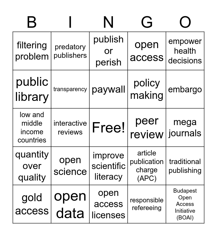 This bingo card has a free space and 24 words: open science, open data, paywall, gold access, empower health decisions, filtering problem, public library, predatory publishers, peer review, improve scientific literacy, policy making, low and middle income countries, article publication charge (APC), traditional publishing, transparency, responsible refereeing, mega journals, publish or perish, embargo, interactive reviews, Budapest Open Access Initiative (BOAI), quantity over quality, open access and open access licenses.