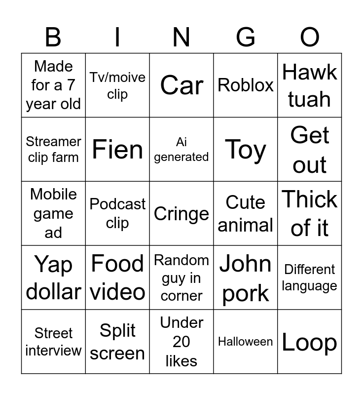 This bingo card has a free space and 24 words: Street interview, Food video, Ai generated, Halloween, Hawk tuah, Made for a 7 year old, Tv/moive clip, Car, Cute animal, Thick of it, Mobile game ad, Fien, John pork, Different language, Streamer clip farm, Split screen, Under 20 likes, Roblox, Get out, Yap dollar, Podcast clip, Random guy in corner, Toy and Loop.