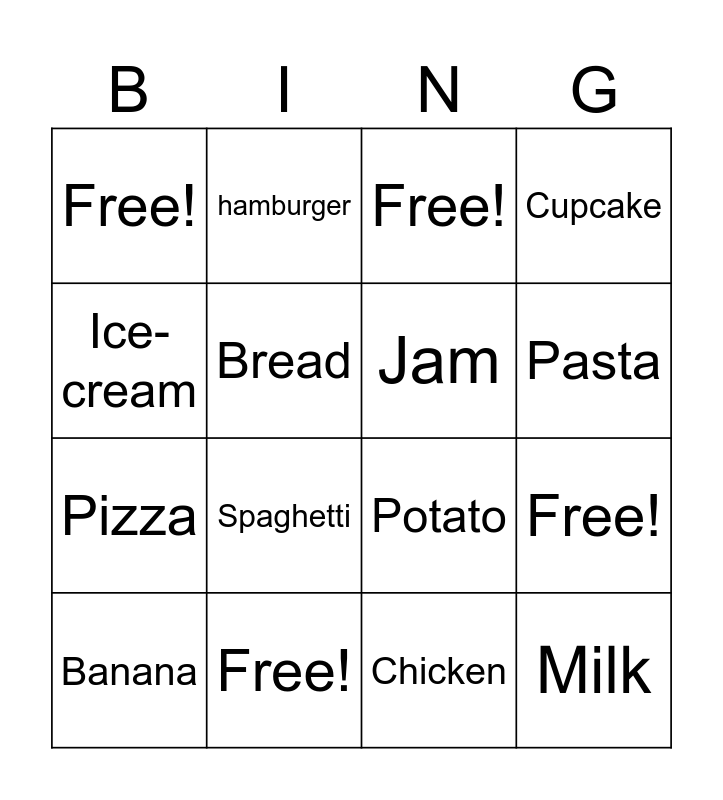 This bingo card has 16 words: Free!, Free!, Free!, Free!, Pizza, hamburger, Potato, Chicken, Ice-cream, Bread, Banana, Cupcake, Spaghetti, Pasta, Jam and Milk.