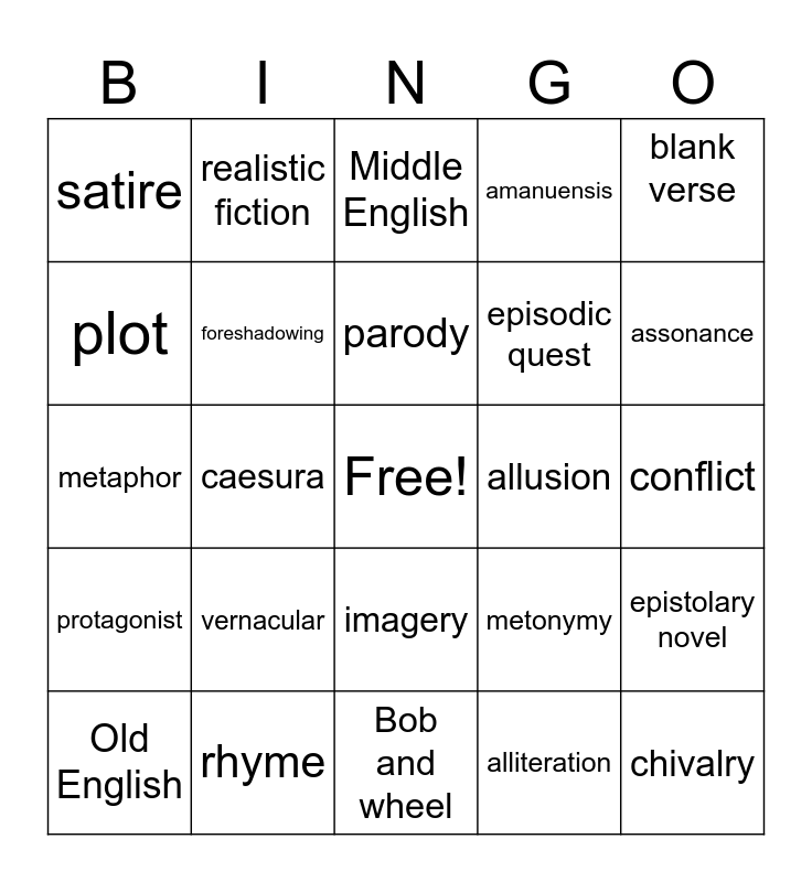 This bingo card has a free space and 29 words: Old English, epic poetry, caesura, kenning, satire, Middle English, foreshadowing, vernacular, allusion, rhyme, conflict, chivalry, Bob and wheel, alliteration, assonance, consonance, imagery, protagonist, blank verse, metaphor, metonymy, allegory, episodic quest, plot, amanuensis, realistic fiction, epistolary novel, parody and episodic narrative.