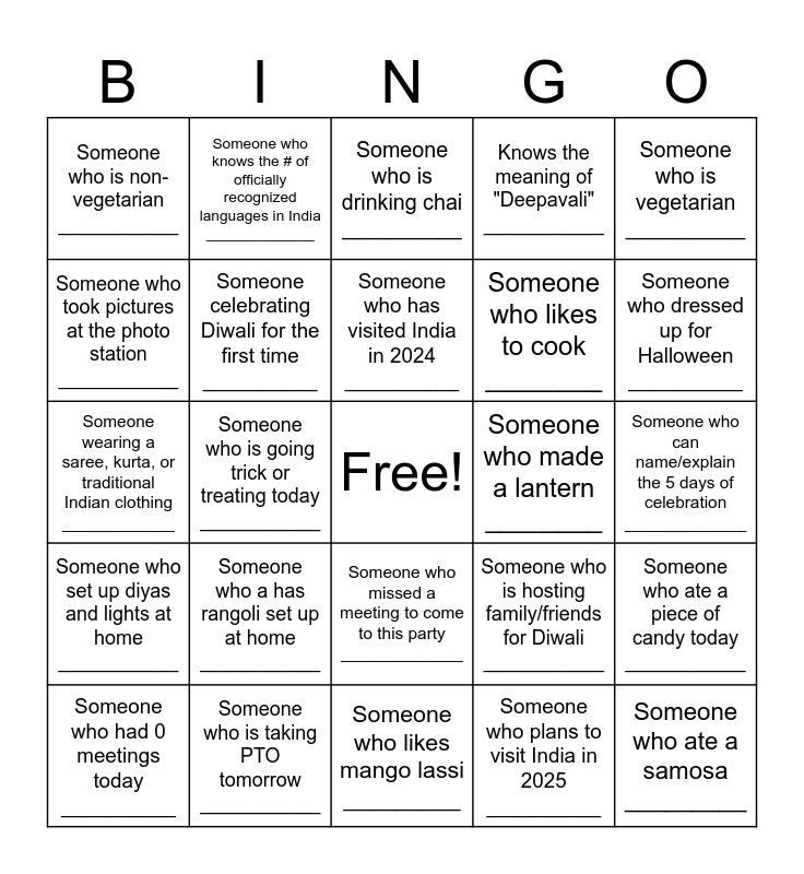 This bingo card has a free space and 24 words: Someone who a has rangoli set up at home ___________, Someone who is taking PTO tomorrow ___________, Someone who has visited India in 2024 __________, Someone who had 0 meetings today __________, Someone who is vegetarian __________, Someone who is non-vegetarian ___________, Someone who took pictures at the photo station ___________, Someone who knows the # of officially recognized languages in India _____________, Someone who made a lantern ________, Someone who missed a meeting to come to this party _____________, Someone who likes to cook ________, Someone wearing a saree, kurta, or traditional Indian clothing ____________, Someone who is hosting family/friends for Diwali ___________, Someone who ate a piece of candy today ___________, Someone celebrating Diwali for the first time __________, Someone who plans to visit India in 2025 __________, Someone who can name/explain the 5 days of celebration _____________, Someone who is drinking chai __________, Someone who dressed up for Halloween __________, Someone who is going trick or treating today ___________, Someone who ate a samosa _________, Someone who set up diyas and lights at home ___________, Knows the meaning of "Deepavali" ___________ and Someone who likes mango lassi _________.