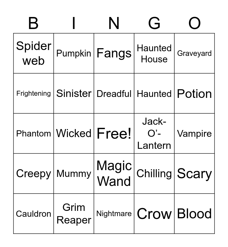 This bingo card has a free space and 45 words: Alien, Blood, Broomstick, Cauldron, Coffin, Crow, Fangs, Ghost, Graveyard, Grim Reaper, Haunted House, Jack-O’-Lantern, Magic Wand, Mummy, Monster, Nightmare, October, Phantom, Pirate, Potion, Pumpkin, Scarecrow, Skeleton, Spider web, Trick Or Treat, Vampire, Werewolf, Zombie, Chilling, Creepy, Eerie, Scary, Slimy, Spooky, Strange, Wicked, Bewitched, Dark, Deadly, Dreadful, Frightening, Haunted, Mysterious, Sinister and Terrifying.