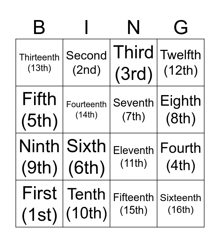 This bingo card has 17 words: Free!, First (1st), Second (2nd), Third (3rd), Fourth (4th), Fifth (5th), Sixth (6th), Seventh (7th), Eighth (8th), Ninth (9th), Tenth (10th), Eleventh (11th), Twelfth (12th), Thirteenth (13th), Fourteenth (14th), Fifteenth (15th) and Sixteenth (16th).