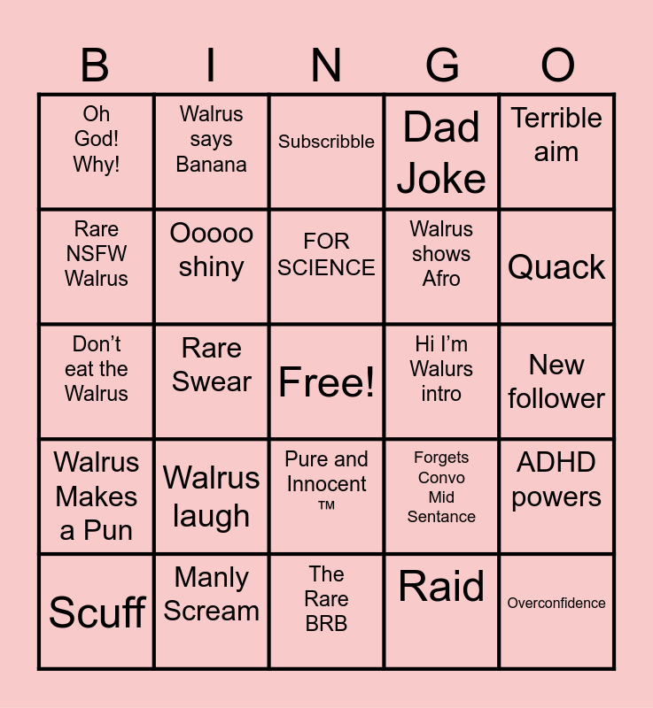This bingo card has a free space and 24 words: Walrus laugh, Manly Scream, FOR SCIENCE, Scuff, Terrible aim, Oh God! Why!, Rare NSFW Walrus, Walrus says Banana, Hi I’m Walurs intro, Pure and Innocent ™, Walrus shows Afro, Don’t eat the Walrus, Forgets Convo Mid Sentance, ADHD powers, Ooooo shiny, Raid, New follower, Subscribble, Quack, Rare Swear, Overconfidence, Walrus Makes a Pun, Dad Joke and The Rare BRB.