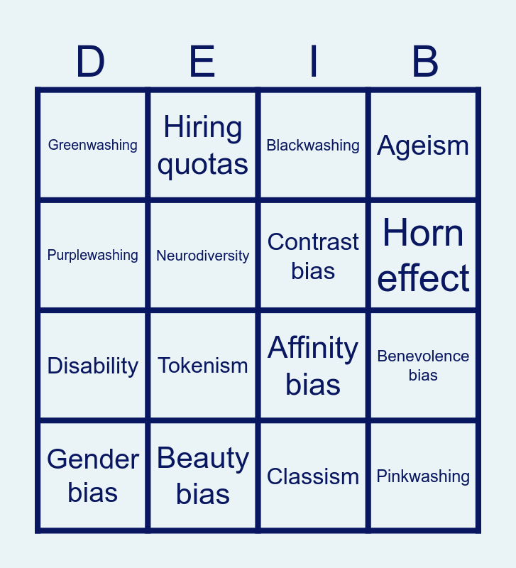 This bingo card has 40 words: Free!, Affinity bias, Conformity bias, Contrast bias, Name bias, Halo effect, Horn effect, Gender literacy, Purplewashing, Pinkwashing, Benevolence bias, Ageism, Gender bias, Classism, Beauty bias, Ableism, Confirmation bias, Greenwashing, Brownwashing, Blackwashing, DEIB, BIPOC, Disability, Neurodiversity, Underrepresented, Microaggression, Microvalidation, Orangewashing, Bluewashing, Redwashing, EEO, STARS, ERGs, Leadership buy-in, Tokenism, Glass ceiling, Sticky floors, Pay equity, Hiring quotas and Gender gap.