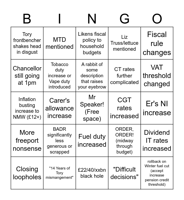 This bingo card has a free space and 24 words: BADR significantly less generous or scrapped, "14 Years of Tory mismangement", A rabbit of some description that raises your eyebrow, Closing loopholes, Fiscal rule changes, Tory frontbencher shakes head in disgust, Chancellor still going at 1pm, MTD mentioned, CGT rates increased, Fuel duty increased, CT rates further complicated, Inflation busting increase to NMW (£12+), ORDER, ORDER! (midway through budget), Dividend IT rates increased, Tobacco duty increase or Vape duty introduced, "Difficult decisions", Er's NI increase, Likens fiscal policy to household budgets, VAT threshold changed, Carer's allowance increase, rollback on Winter fuel cut (accept increase pension credit threshold), More freeport nonsense, Liz Truss/lettuce mentioned and £22/40/xxbn black hole.