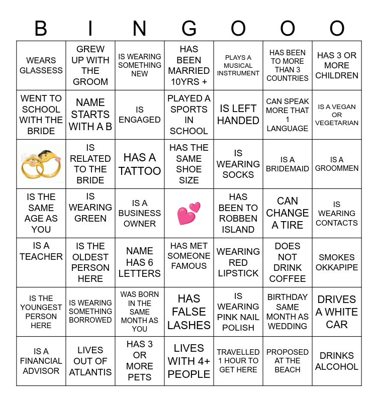 This bingo card has 1 images, a free space and 47 words: IS A TEACHER, IS WEARING GREEN, HAS 3 OR MORE PETS, HAS MET SOMEONE FAMOUS, IS LEFT HANDED, CAN CHANGE A TIRE, HAS 3 OR MORE CHILDREN, IS A FINANCIAL ADVISOR, IS RELATED TO THE BRIDE, IS A BUSINESS OWNER, HAS BEEN MARRIED 10YRS +, PLAYS A MUSICAL INSTRUMENT, IS A BRIDEMAID, IS A GROOMMEN, IS THE SAME AGE AS YOU, IS WEARING SOMETHING BORROWED, IS WEARING SOMETHING NEW, HAS THE SAME SHOE SIZE, IS WEARING PINK NAIL POLISH, HAS BEEN TO MORE THAN 3 COUNTRIES, IS A VEGAN OR VEGETARIAN, WENT TO SCHOOL WITH THE BRIDE, GREW UP WITH THE GROOM, IS ENGAGED, TRAVELLED 1 HOUR TO GET HERE, CAN SPEAK MORE THAT 1 LANGUAGE, IS WEARING CONTACTS, IS THE YOUNGEST PERSON HERE, IS THE OLDEST PERSON HERE, HAS A TATTOO, HAS FALSE LASHES, IS WEARING SOCKS, BIRTHDAY SAME MONTH AS WEDDING, DRIVES A WHITE CAR, WEARS GLASSESS, LIVES OUT OF ATLANTIS, NAME HAS 6 LETTERS, LIVES WITH 4+ PEOPLE, HAS BEEN TO ROBBEN ISLAND, PROPOSED AT THE BEACH, SMOKES OKKAPIPE, NAME STARTS WITH A B, WAS BORN IN THE SAME MONTH AS YOU, PLAYED A SPORTS IN SCHOOL, WEARING RED LIPSTICK, DOES NOT DRINK COFFEE and DRINKS ALCOHOL.