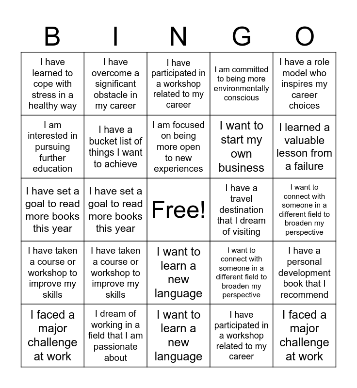 This bingo card has a free space and 49 words: I learned a valuable lesson from a failure, I faced a major challenge at work, I’ve achieved a personal milestone this year, I want to learn a new language, I have taken a course or workshop to improve my skills, I want to explore a new hobby or interest, I have overcome a significant obstacle in my career, I’ve picked up new skills through online courses, I am interested in pursuing further education, I dream of working in a field that I am passionate about, I have a bucket list of things I want to achieve, I am committed to being more environmentally conscious, I have a personal development book that I recommend, I want to connect with someone in a different field to broaden my perspective, I want to engage in more creative activities, like painting or writing, I want to break out of my comfort zone this year, I am focused on being more open to new experiences, I have a travel destination that I dream of visiting, I have a personal challenge I am currently working on, I have a role model who inspires my career choices, I have set a goal to read more books this year, I have participated in a workshop related to my career, I have learned to cope with stress in a healthy way, I want to start my own business, I want to limit my screen time to improve my mental clarity and focus, I learned a valuable lesson from a failure, I faced a major challenge at work, I’ve achieved a personal milestone this year, I want to learn a new language, I have taken a course or workshop to improve my skills, I want to explore a new hobby or interest, I have overcome a significant obstacle in my career, I’ve picked up new skills through online courses, I am interested in pursuing further education, I dream of working in a field that I am passionate about, I have a bucket list of things I want to achieve, I am committed to being more environmentally conscious, I have a personal development book that I recommend, I want to connect with someone in a different field to broaden my perspective, I want to engage in more creative activities, like painting or writing, I want to break out of my comfort zone this year, I have a travel destination that I dream of visiting, I have a personal challenge I am currently working on, I have a role model who inspires my career choices, I have set a goal to read more books this year, I have participated in a workshop related to my career, I have learned to cope with stress in a healthy way, I want to start my own business and I want to limit my screen time to improve my mental clarity and focus.