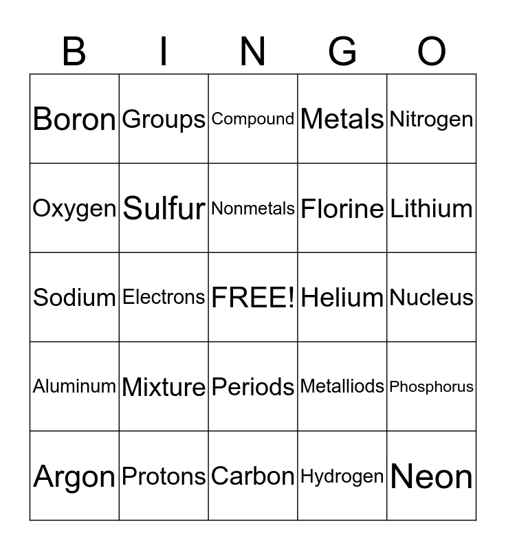 This bingo card has a free space and 24 words: Mixture, Protons, Nonmetals, Argon, Nitrogen, Boron, Oxygen, Groups, Helium, Periods, Florine, Sodium, Metalliods, Phosphorus, Sulfur, Hydrogen, Nucleus, Compound, Lithium, Electrons, Neon, Aluminum, Metals and Carbon.