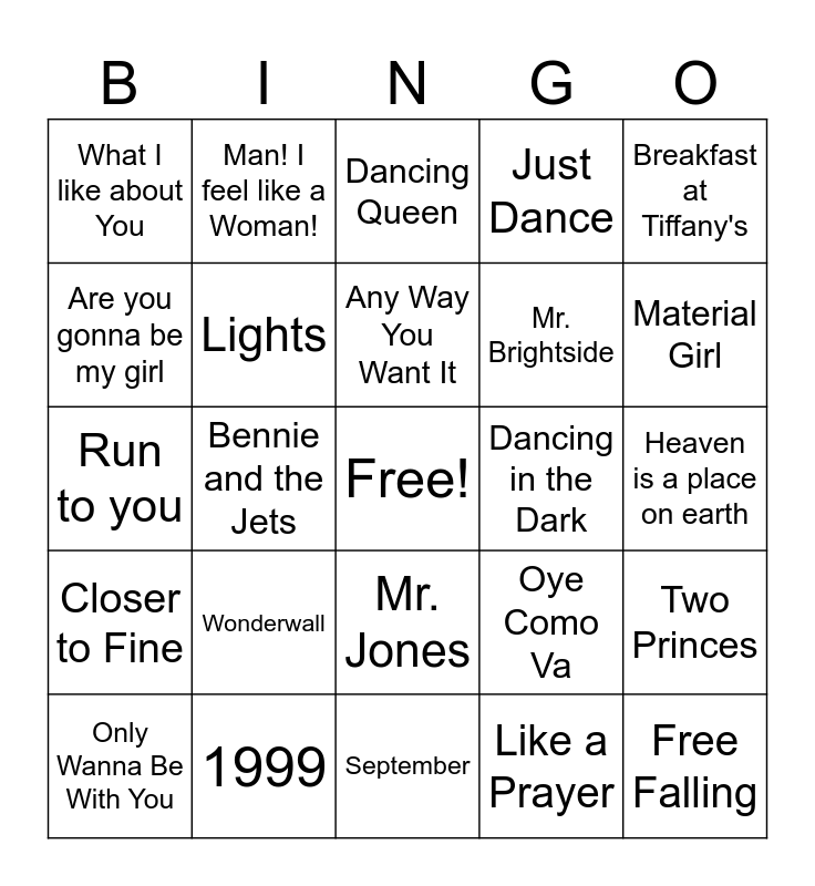 This bingo card has a free space and 31 words: September, Staying Alive, Bennie and the Jets, Born to Run, What I like about You, Dancing Queen, Lights, Oye Como Va, Dancing in the Dark, Like a Prayer, Heaven is a place on earth, Free Falling, Jessies Girl, Don't You Forget About Me, Material Girl, Vogue, Two Princes, Wonderwall, Closer to Fine, Mr. Jones, Breakfast at Tiffany's, How Bizarre, Only Wanna Be With You, Man! I feel like a Woman!, Mr. Brightside, Are you gonna be my girl, Just Dance, Run to you, 1999, Any Way You Want It and Another one bites the dust.