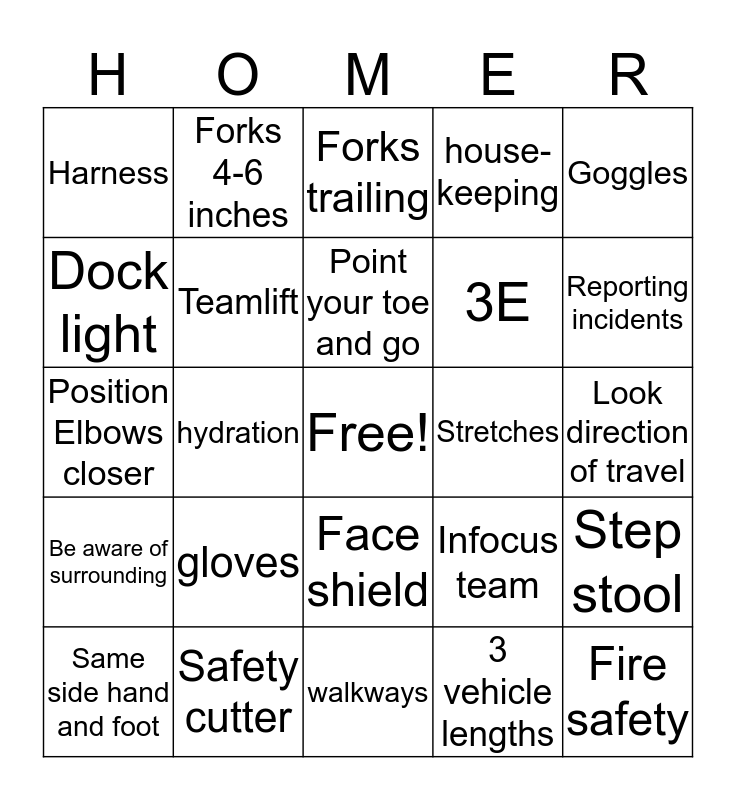 This bingo card has a free space and 24 words: gloves, Safety cutter, Point your toe and go, Same side hand and foot, Goggles, Harness, Dock light, Forks 4-6 inches, Stretches, Face shield, 3E, Position Elbows closer, Infocus team, Step stool, Teamlift, 3 vehicle lengths, Look direction of travel, Forks trailing, Reporting incidents, hydration, Fire safety, Be aware of surrounding, house-keeping and walkways.