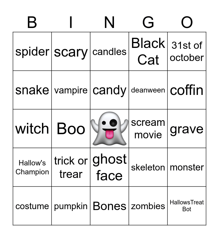 This bingo card has a free space and 24 words: trick or trear, pumpkin, candy, costume, 31st of october, spider, snake, scary, scream movie, ghost face, deanween, witch, skeleton, monster, vampire, zombies, grave, candles, coffin, Boo, HallowsTreat Bot, Hallow's Champion, Black Cat and Bones.