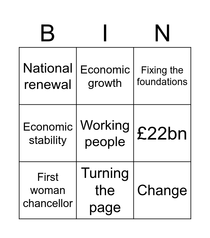 This bingo card has a free space and 8 words: £22bn, Fixing the foundations, Economic growth, First woman chancellor, National renewal, Change, Economic stability and Turning the page.